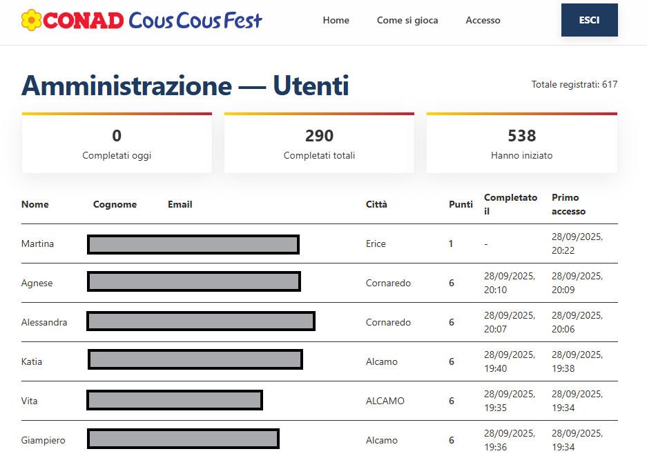 In accordo con il cliente, ho scelto di raccogliere esclusivamente dati essenziali, aggiungendo solo la città di provenienza a fini statistici. In parallelo, abbiamo semplificato drasticamente il processo di registrazione, eliminando l’uso delle password per ridurre attriti e tempi di accesso. Questa scelta è stata motivata anche dalla volontà di evitare una quota di abbandono legata a problematiche comuni come password dimenticate, procedure di recupero o frustrazione nell’accesso, particolarmente rilevanti considerando il contesto d’uso: utenti che giocano all’aperto, sotto il caldo di settembre, a San Vito Lo Capo.